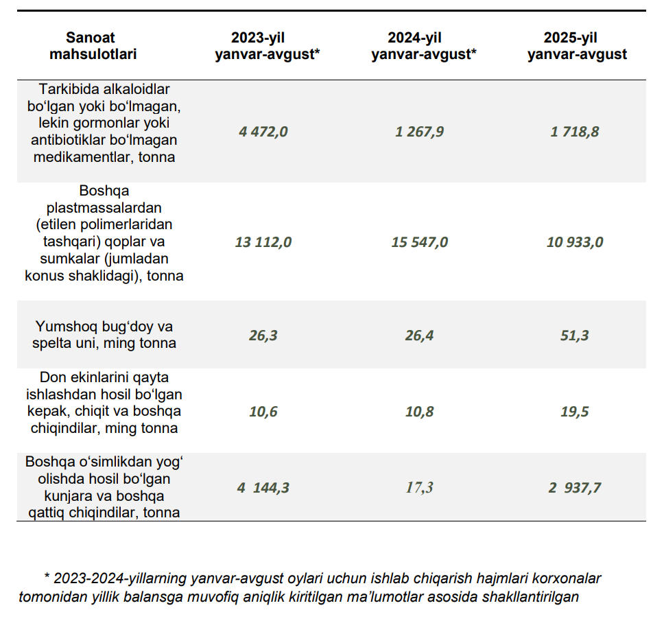 2025-yilning yanvar-avgust oylarida viloyatda 51,3 ming tonna yumshoq bugʻdoy va spelta uni (2024-yilning yanvar-avgust oylariga nisbatan 94,5 % ga ko‘paygan), 19,5 ming tonna kepak mahsulotlari (80,3 % ga koʻpaygan), 473,3 ming litr 100 % spirt aroq mahsulotlari (85,7 %) hamda 1,7 ming tonna dori vositalari (35,6 % ga koʻpaygan) ishlab chiqarilgan.